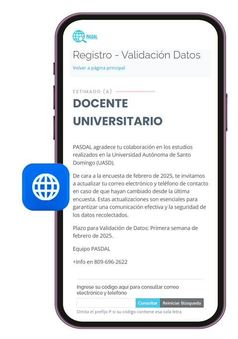 Te invitamos a verificar y actualizar tus datos personales en la aplicación generada por PASDAL antes de la próxima encuesta programada para febrero de 2025. Esta encuesta tiene como objetivo evaluar la gestión actual e identificar el posicionamiento electoral de quienes han sido mencionados como aspirantes a cargos electivos en el proceso electoral UASD 2026.